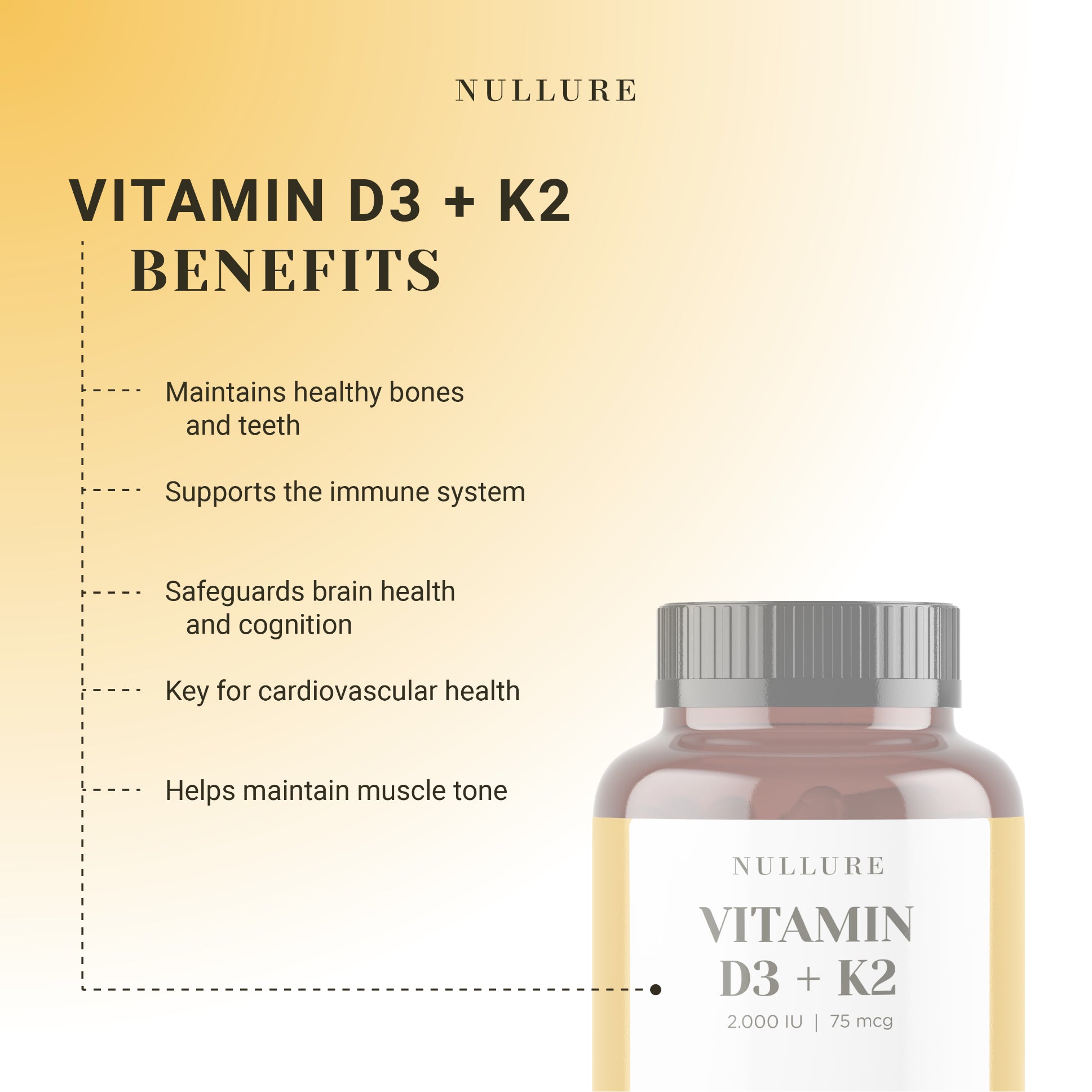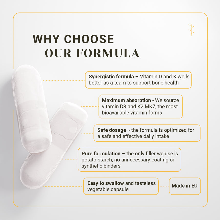 Vitamin D3 und K2 (MK7) wirken synergetisch, um starke Knochen und Zähne zu fördern, das Immunsystem auszugleichen und zu stärken und die kardiovaskuläre Gesundheit zu unterstützen.