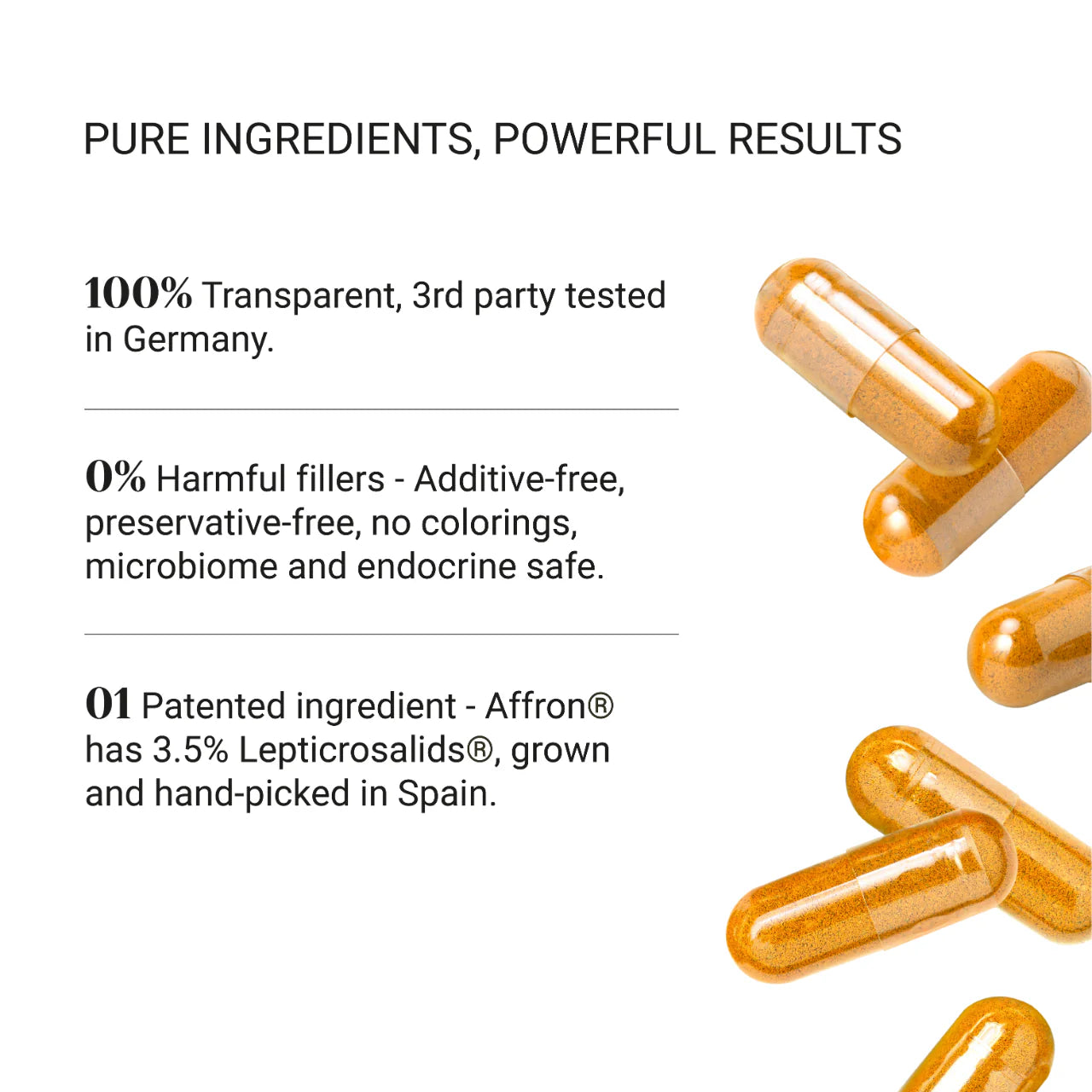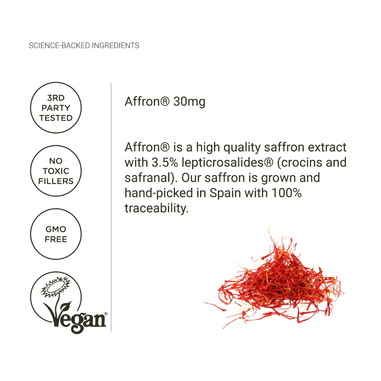 Azafrán (Affron®) tiene potentes propiedades antioxidantes y antiinflamatorias. Se utiliza para reducir la ansiedad, mejorar el estado de ánimo, aumentar la calidad del sueño y favorecer la salud cognitiva